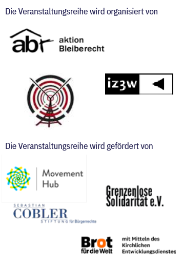 Die Veranstaltungsreihe wird gefördert von Muvement Hub, Grenzenlose Solidarität e. V., von der Sebastian COBLER Stiftung für Bürgerrechte und von Brot für die Welt mit Mitteln des kirchlichen Entwicklungsdienstes.